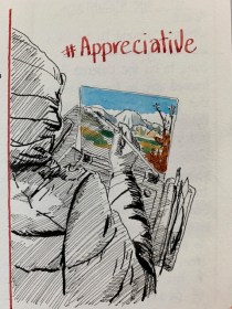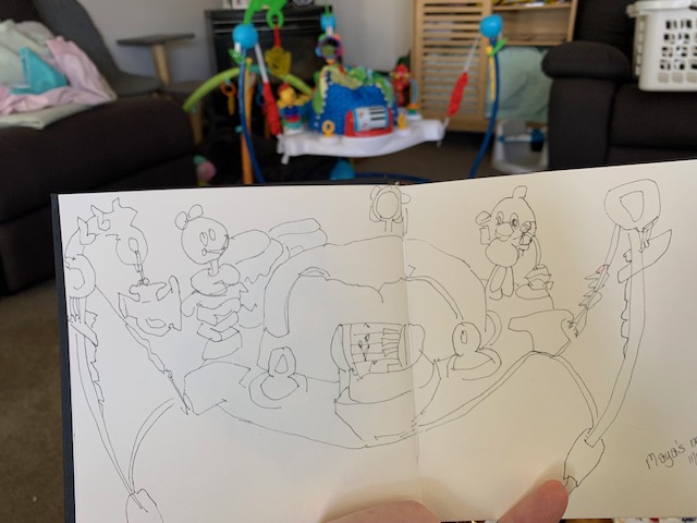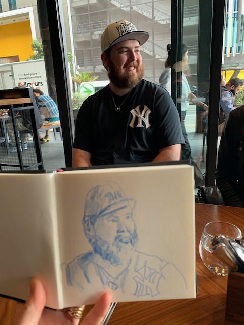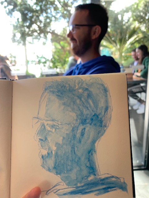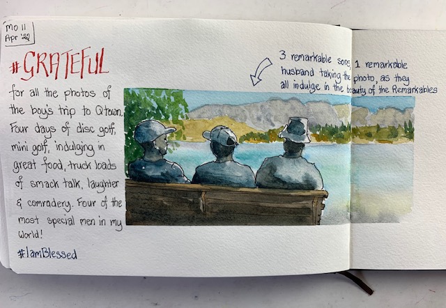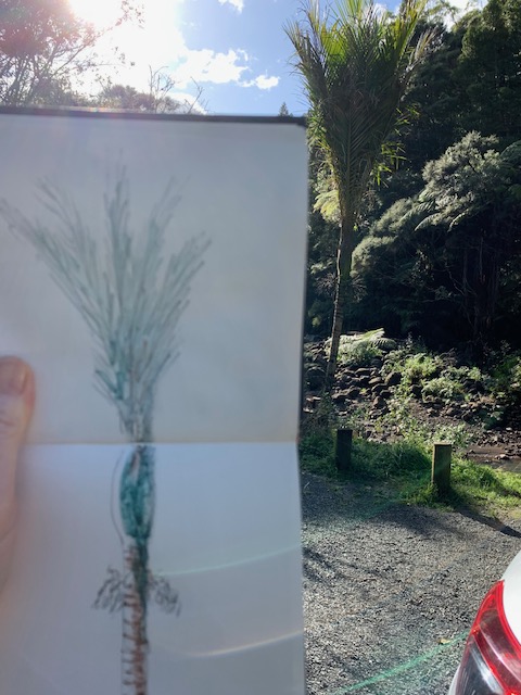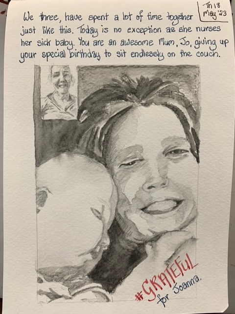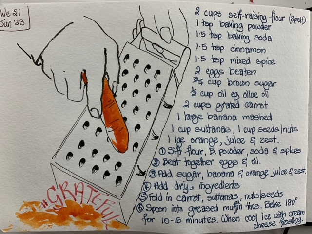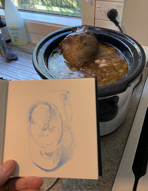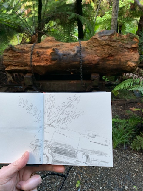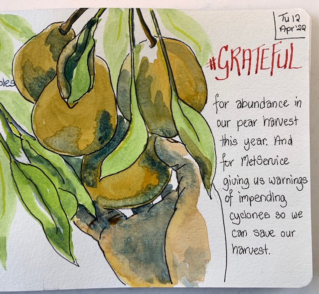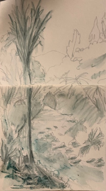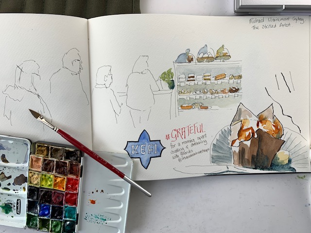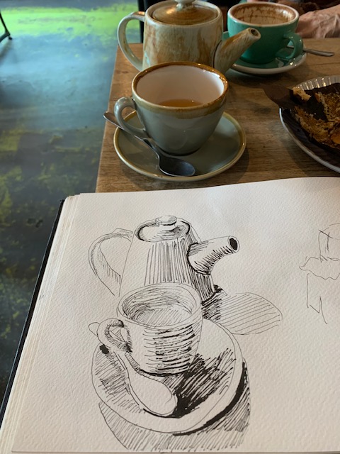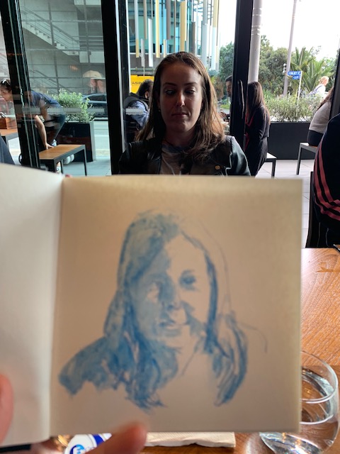 I got to spend time with new Mama and cuddle that gorgeous grandbaby. It was my first time as a ‘Mummy-in-Law’ and we had a few laughs along the way. Then on to Auckland where youngest son took me for a sedate mother’s walk (not one of his normal ‘ascend the mountain’ jobs) through the bush. It had just rained heavily and the waterfalls were flowing large while the wet bush smell was intoxicating. Such a treat! There was food a-plenty all weekend both home-cooked treats and eating out, all served with lots of laughing and friendly banter. Variety was the name of the game. I kept pulling my pencils out keeping my visual diary flowing. They, used to me, waited patiently enabling my objectives.