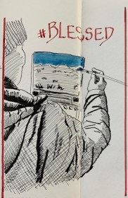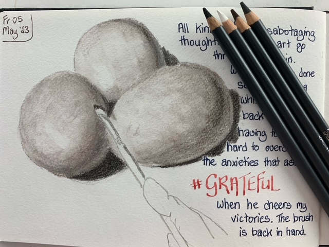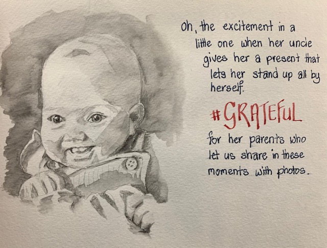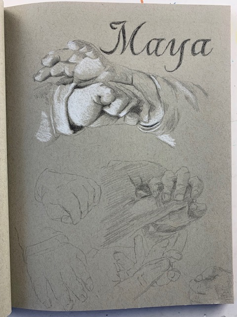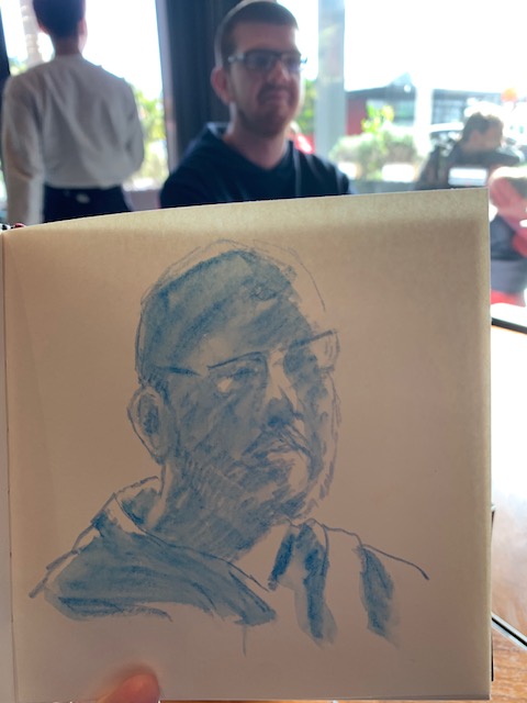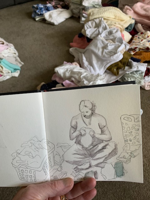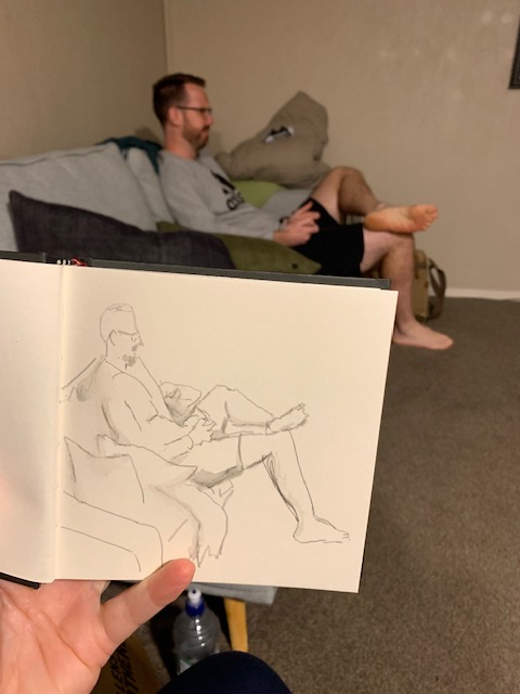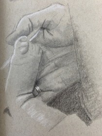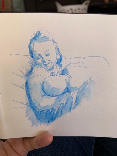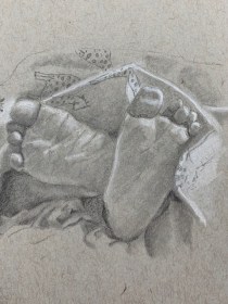 Being welcomed into their worlds is a special honour and I wanted to enjoy every minute of it, thus the idea was conceived to draw my time with them in 5-minute sketches. There are 5 of them after all…well, there used to be before adding a son-in-law and grandbaby to the mix. This was also a way to leave the studio without actually leaving, focusing on speed drawing. Five minutes allows for no fussing over details. Of course, you need to have a tight rein on your inner talk because you can do some real doozies when moving so quickly. So, armed and eager, I kissed Hubby goodbye and set off on my journey.