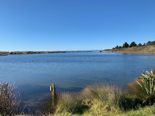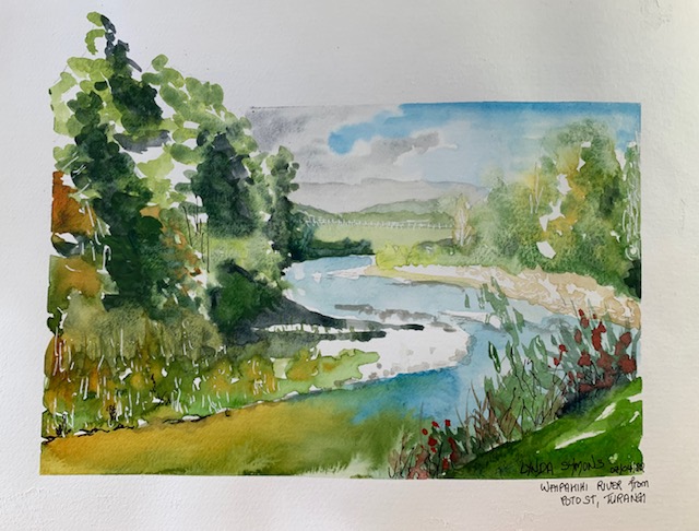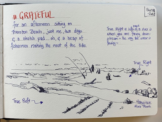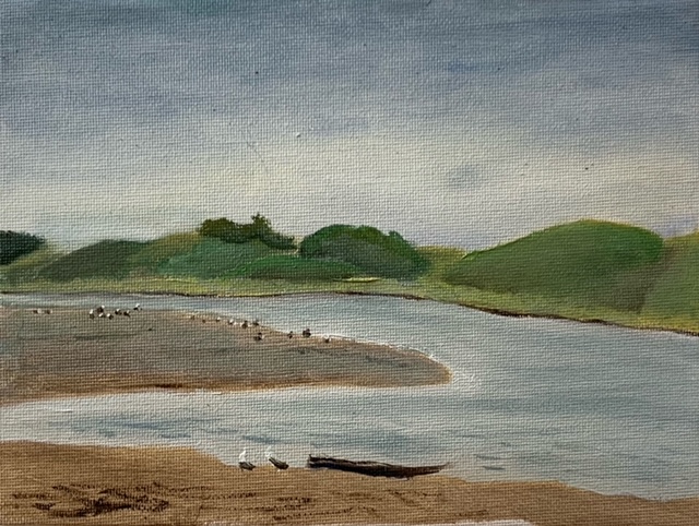 Today I wanted to paint the gentle eddy at the Rangitaiki river mouth. In summer I can imagine this would be full of children splashing and playing in its gentle water. Fresh water with a mix of salt. The sea breeze coming over the sand dunes to help cool everyone off. But today, we were the only muggins around. So while Claire took the dogs for a romp, Wendy and I set ourselves up and began to paint.