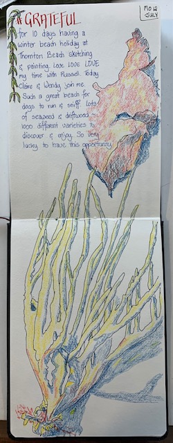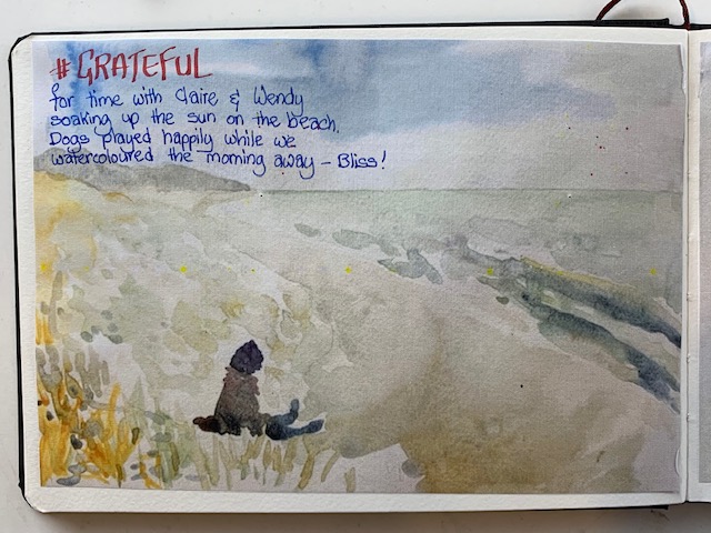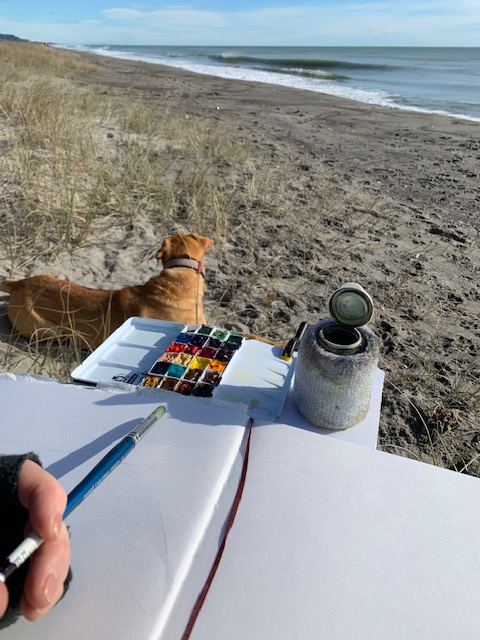 True to form of this all-over-the-place winter, the next day came bearing bright sunshine that had all our layers gone and indulging in glorious sunshine. What a relief! So we made the most of it and headed over the sand dunes to the main beach. Spicing things up we had watercolour as our medium today. My lesson learned today was to keep my hand in things. For the past 3 months I haven’t touched my watercolour while I’ve been trying out the coloured pencils and primary colours, etc. Boy, did it show! I was all at 6’s and 7’s to start with. But by the time Wendy’s lesson in painting a log on the beach came, I had regained a bit of control.