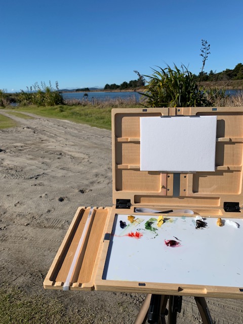 As a tip, Pizza boxes make very good places to put wet oil paintings while they dry. From experience I can tell you that wet paint throughout your car is NOT a good thing. So, the next morning we went in to Whakatane, approximately 15 minutes drive away, and indulged in pizza for lunch while purchasing some clean boxes for storing my paintings from this trip. A bench seat on the Whakatane River provided the next spot to draw from.