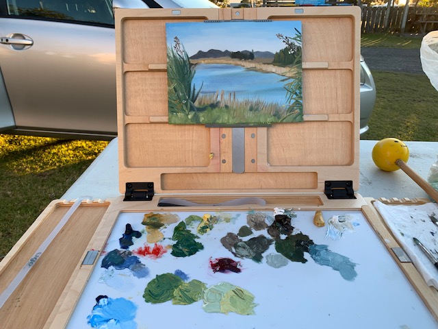 ‘En plein air’ is a term coined by the French which means ‘in the outdoors’. Outdoor painting comes with its own set of challenges. You only get approx 2 hours per painting as the light has changed significantly in that time. If you stay too long your shadows will be coming from the opposite direction, or will be twice as long. Colours change according to the time of day and are much more vivid than in a photo. A photo also takes away the 3d aspect. Battling the elements of weather and insect life help to make it a full immersion experience, which just gets me all excited.