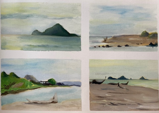 My plan was to divide a canvas into four and do each scene from last weekend in a small oil vignette. Starting out small means I have to eliminate loads of detail. Big shapes only. The impression of. It’s more of a study allowing time to get colours right and determine light and shadows and is supposed to take approx 20 minutes each. With my darling, and very patient man taking the dogs for a two hour ramble up the beach, I was able to stay focused and really enjoy the process.