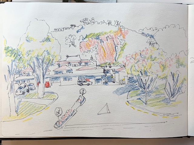 Feeling emotionally bouyant again, I tackled the back of the Whakatane main street shops. So many lovely angles butting up against each other and all nestled in the colourful cliffs rising close behind. No pencil now but straight into the ink and coloured pencil. Getting those impressions down on paper.