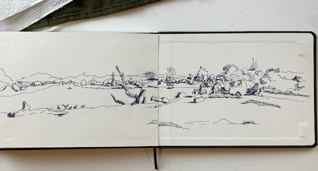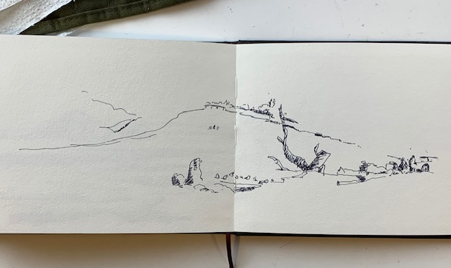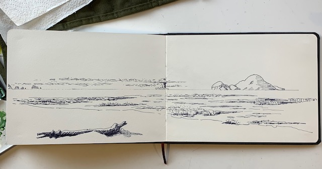 The first weekend was a scout-out-the-land trip. Was the campground suitable? Was there lots to paint? Was it going to be suitable with dogs in tow? It passed with flying colours. On the first full day there I went out to the point and happily sketched from one spot, moving my chair 90° for each drawing. The objective was to begin to get my eye in the game and really see what was there. So, it was ink (no rubbing out) and no colour. Just keep it simple and concentrate on perspective.